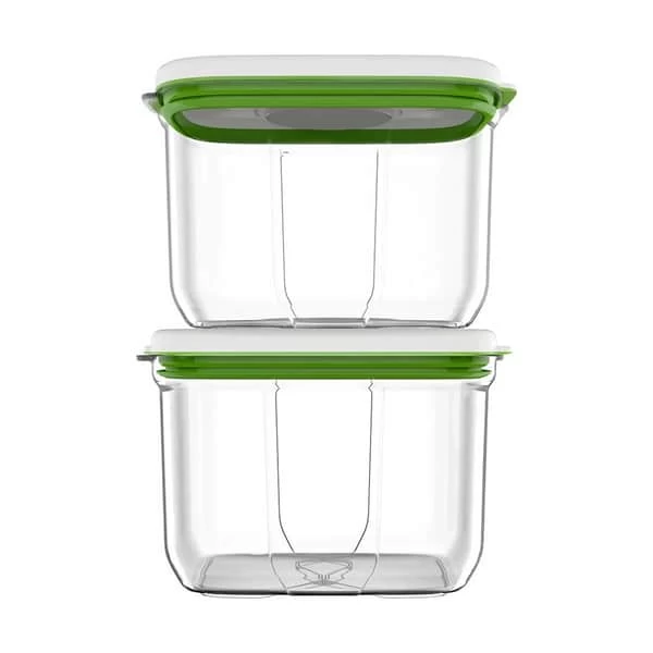 Fyld dine madvarer i en beholder, sæt låget på og placer vakuummotoren på toppen. Tryk på den grønne knap og vent til låget klikker. Nu er luften suget ud, og der er vakuum i beholderen, så du sikkert kan stille dine madvarer i køleskabet. Beholderne kan stables, så du kan skabe orden og få et godt overblik over dine madvarer i køleskabet.