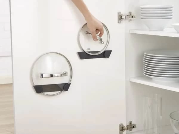 Grydelåg kan være svære at opbevare løst i en køkkenskuffe. Men med grydelågsholderne fra Joseph Joseph kan du nemt opbevare dem på indersiden af køkkenskabet eller i en dyb skuffe og spare plads.