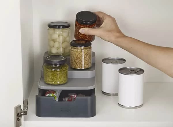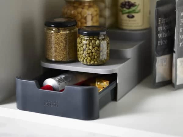 Bouillonterninger, tebreve, tuber med tomatpasta og elastikker, der ligger løst. Det kan hurtigt blive noget rod i køkkenskabe og skuffer. Men med opbevaringssystemet fra Joseph Joseph kan du nemt skabe overblik og orden ved at give alle småtingene en fast plads.
