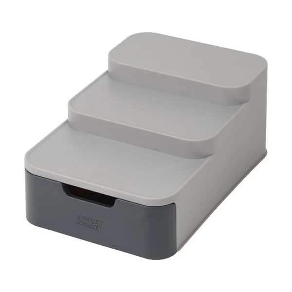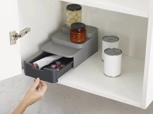 Opbevaringssystemet er niveauinddelt og har en praktisk skuffe, så du kan se dåser og krukker bagest i skabet og samtidig få nem adgang til småtingene i skuffen. Opbevaringssystemet har en kompakt størrelse og er derfor velegnet til skabe, der måler minimum 26 cm i dybden.