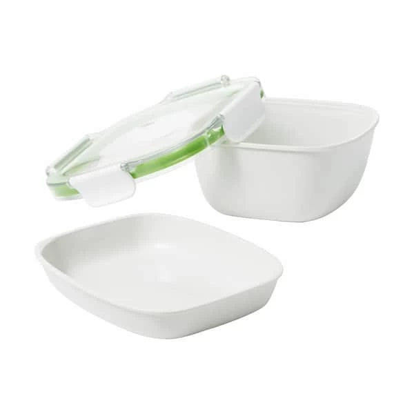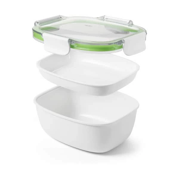 Frokost-beholderen fra OXO har en tyk silikonepakning og en solid lukkemekanisme, som holder 100% tæt. Den har to separate, tætte rum, som holder maden frisk og sprød, og er ideel til fx en sandwich og en salat, en rest efter aftensmaden og nogle skiver rugbrød. Beholderen er BPA-fri og tåler at komme i fryser, mikrobølgeovn og opvaskemaskine. Silikonepakningen kan nemt løsnes for rengøring.